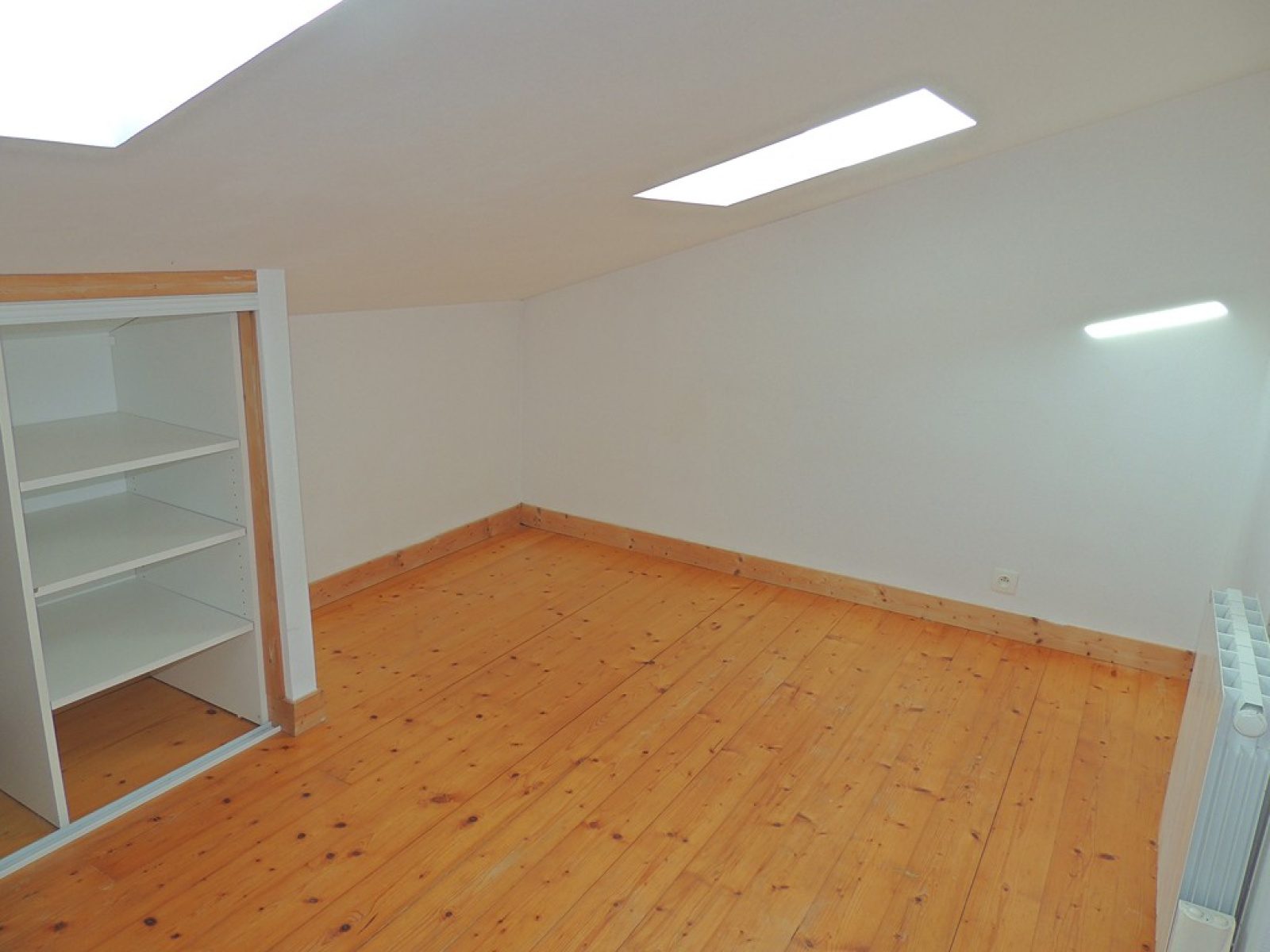 A l'étage : une chambre mansardée (placard), un bureau mansardé et une salle d'eau avec wc.