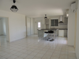 Maison de plain-pied de 80 m² comprenant : entrée, salon-séjour avec cuisine aménagée ouverte, 3 chambres, salle de bains, wc.
